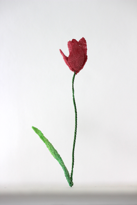 1.5mmの紙糸をかぎ針で編み、その上に版画で着彩をしています。